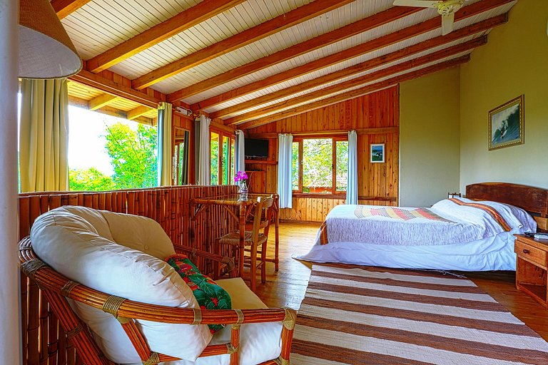 O Chalé Praiano é um chalé de dois andares, dois quartos e dois banheiros, em madeira e alvenaria, com varanda com rede, cozinha completa, churrasqueira interna e todo o conforto para quatro pessoas, embora aceite até cinco. O quarto principal fica no andar superior e possui varanda, ar condicionado e ventilador de teto, TV Smart 32" e cama queen size. O segundo quarto fica no térreo, é menor e não tem ar condicionado. Pode receber duas camas de solteiro ou uma de casal. O chalé oferece privacidade total e contato com a natureza da mata nativa, e além da proximidade estratégica da praia e do centrinho do Rosa nossos hóspedes podem desfrutar também da piscina panorâmica e do saboroso café da manhã, com especialidades caseiras produzidas no dia.