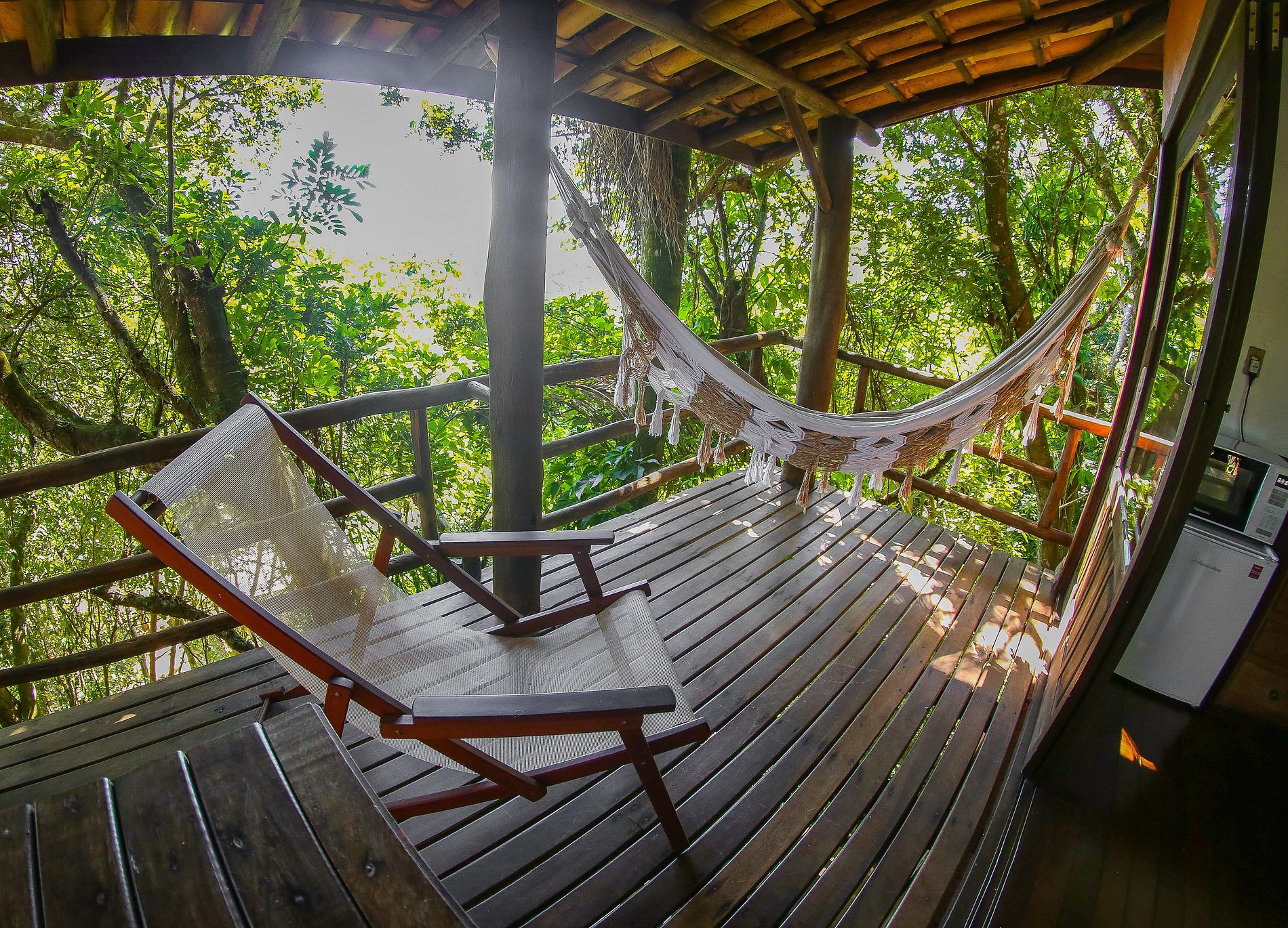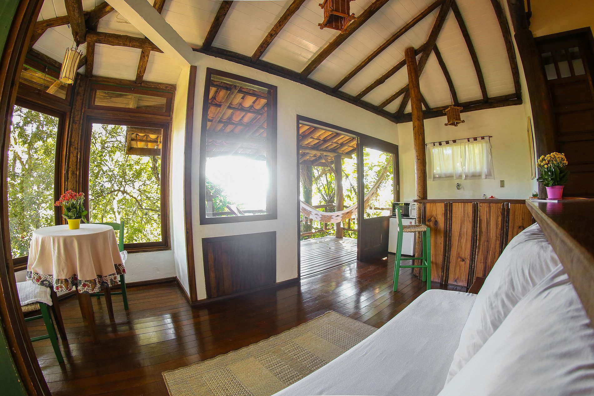 Cabana completa composta de suite com cama de casal, saleta com opção para cama de solteiro, cozinha completa, varanda com rede e área externa com mesa e guarda-sol, localizada em meio à vegetação nativa. Possui ar condicionado e TV tela plana via satélite.